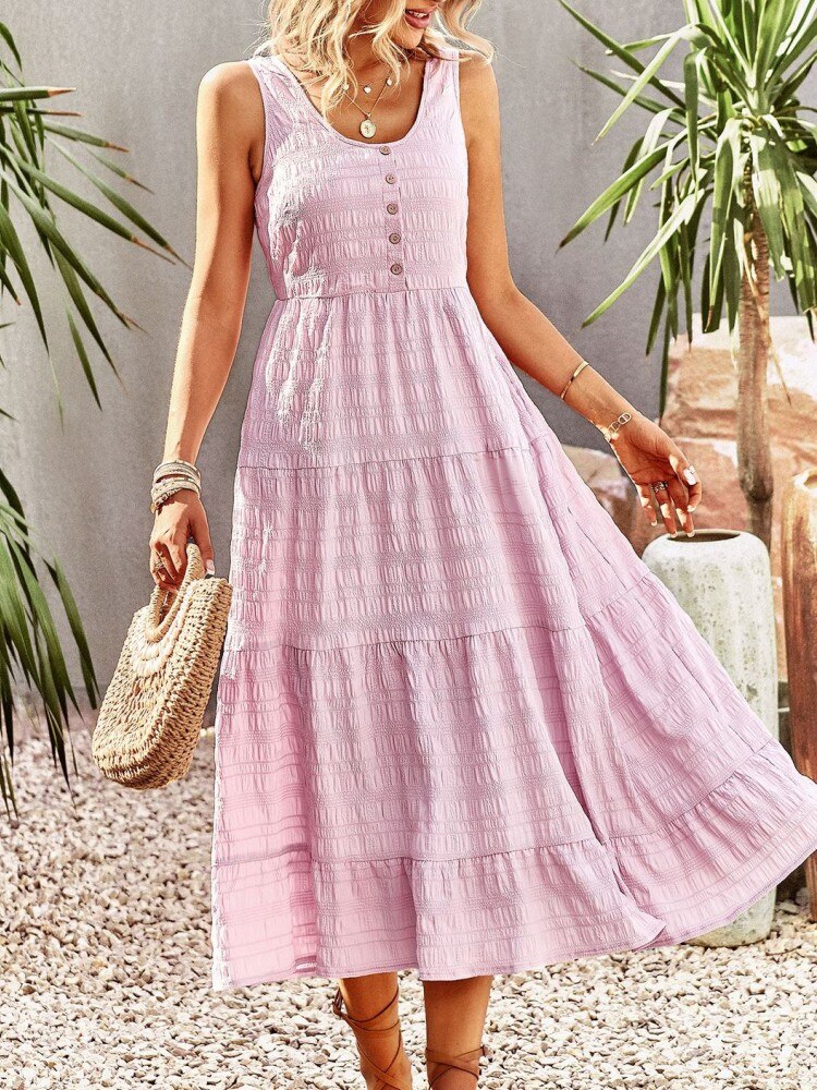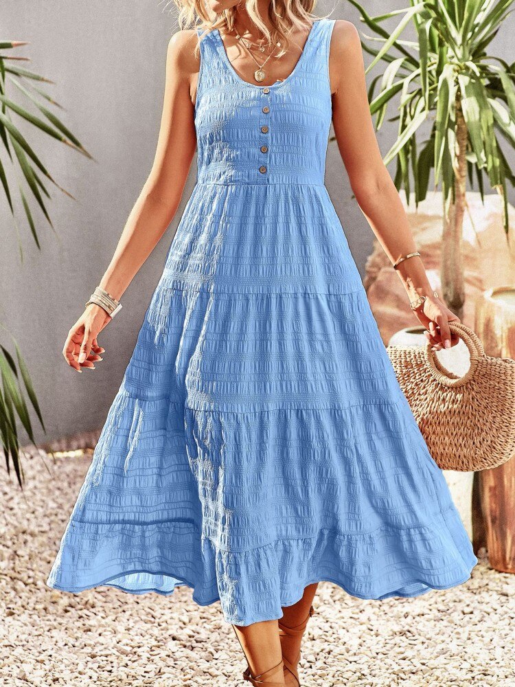 Chic A-line Sleeveless Ruffles Pocket Summer Dress For Women Elegant O-neck Button White Dress Ladies Beach Holiday Sundresses